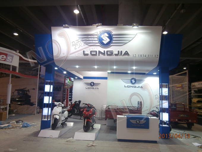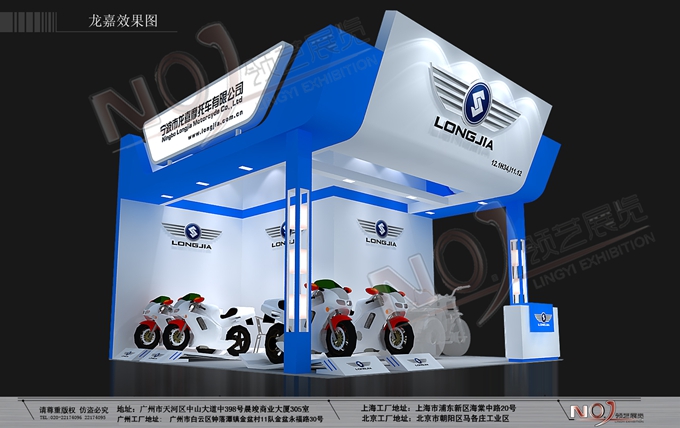 契合龍嘉摩托的品牌形象和產(chǎn)品特性,采用框型結(jié)構(gòu),再搭配燈具燈光的效果,襯托出展位超前、簡約的氛圍,突出一種融合、個(gè)性的時(shí)尚品味。