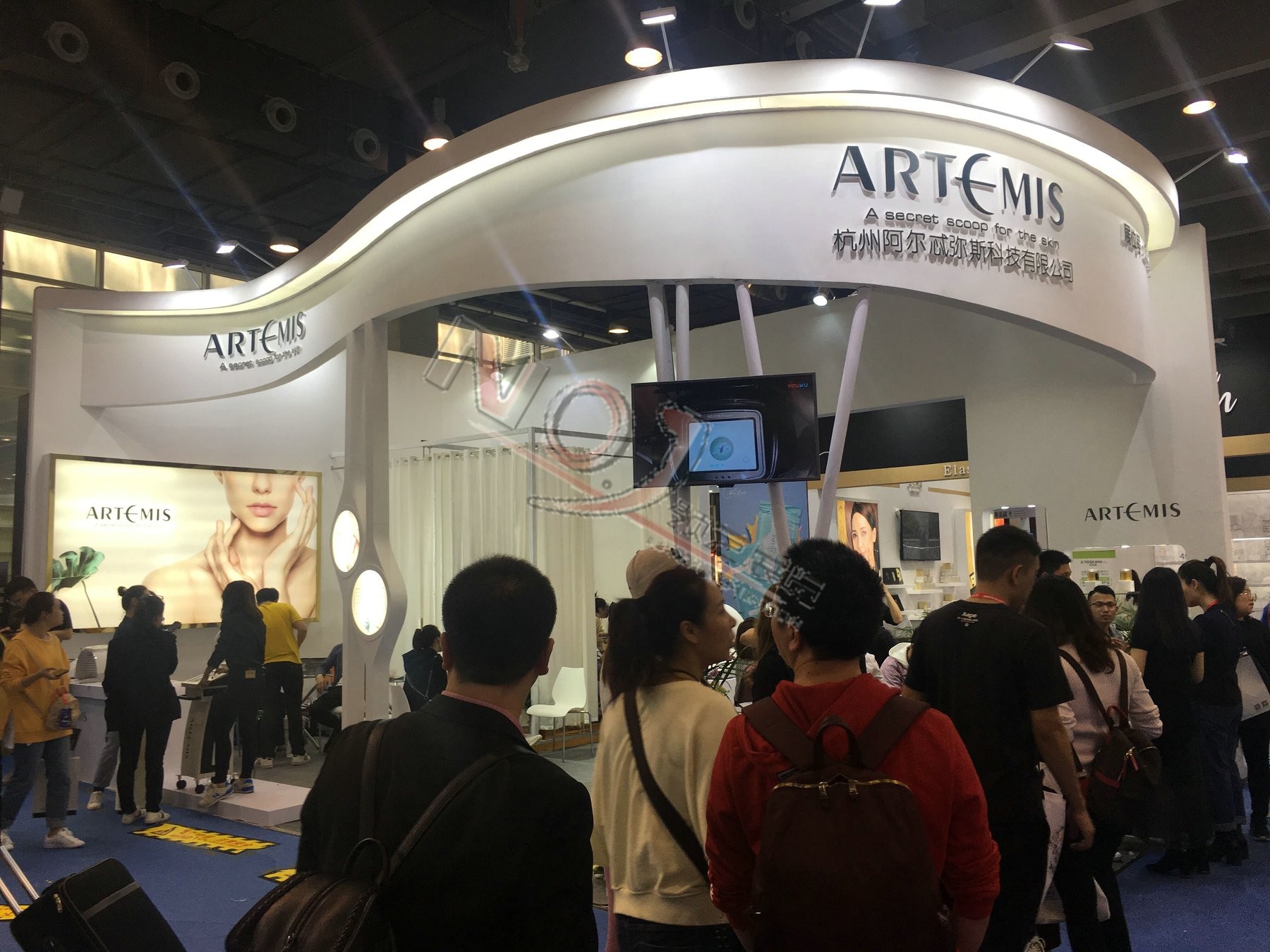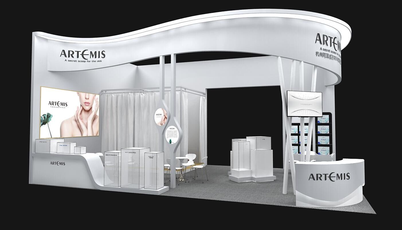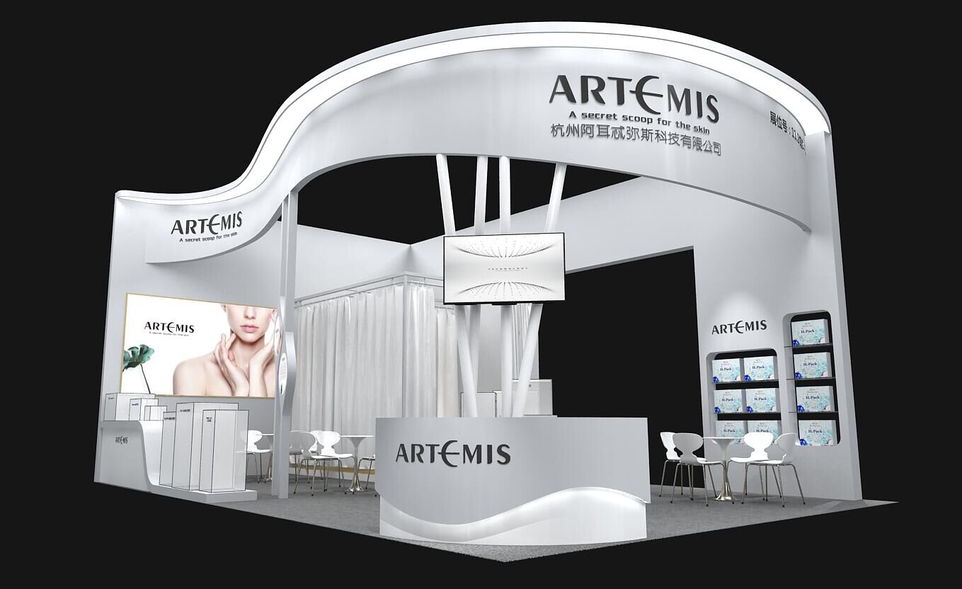 契合阿爾忒彌斯形象和產品特性,采用異形天花結構,再搭配燈具燈光的效果,襯托出展位簡約、時尚的氛圍,突出一種現代、簡約的時尚品味。