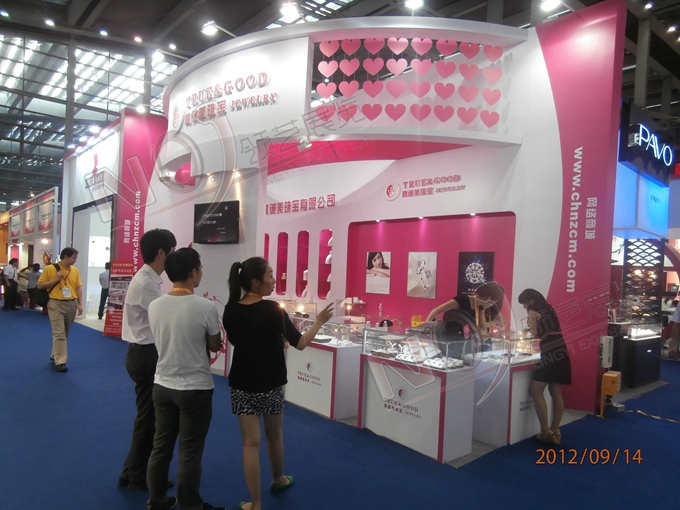 契合真誠美珠寶的品牌形象和產(chǎn)品特性,以弧形結(jié)構(gòu)為主造型,再搭配燈具燈光的效果,襯托出展位絢麗、商務(wù)的氛圍,突出一種典雅、尊貴的時尚品味。
