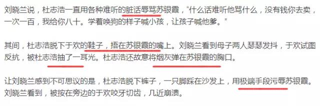 吳學(xué)占讓手下拉屎,并將蘇銀霞按進(jìn)馬桶里,要求還錢(qián)。案發(fā)當(dāng)天,蘇銀霞和于歡母子被關(guān)在了一起?!笆裁丛掚y聽(tīng)他罵什么,沒(méi)有錢(qián)你去賣,一次一百,我給你八十。學(xué)著喚狗的樣子喊小孩,讓孩子喊他爹?!倍胖竞泼撓掠跉g的鞋子,捂在蘇銀霞的嘴上。杜志浩脫下褲子,一只腳踩在沙發(fā)上,用極端手段污辱蘇銀霞。一個(gè)小時(shí)后,失控的于歡,抄起水果刀瘋狂捅向逼債者,結(jié)果四人中刀,其中杜志浩失血過(guò)多死亡。