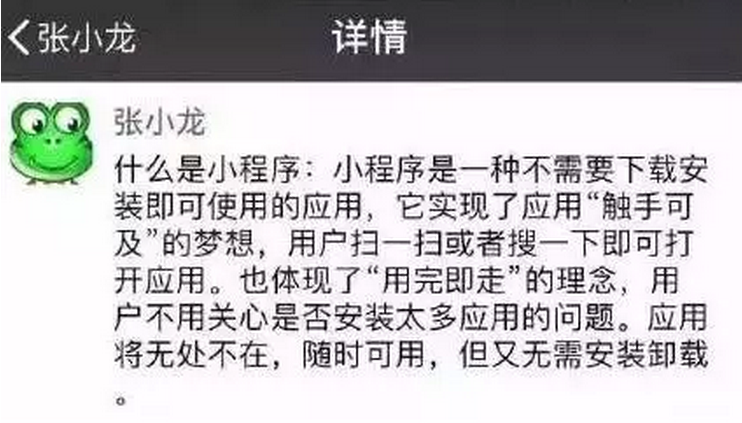 什么是微信小程序呢?根據(jù)張小龍的官方解釋,微信小程序,簡稱CX,是一種不需要下載安裝即可使用的應(yīng)用,它實現(xiàn)了應(yīng)用“觸手可及”的夢想,用戶掃一掃或搜一下即可打開應(yīng)用。用最簡明扼要、通俗易懂的關(guān)鍵詞概括就是:又小又快的應(yīng)用。體積小,不超過1M,打開快速,用完即走,來去自如,和進(jìn)入一個網(wǎng)站頁面差不多的感覺。