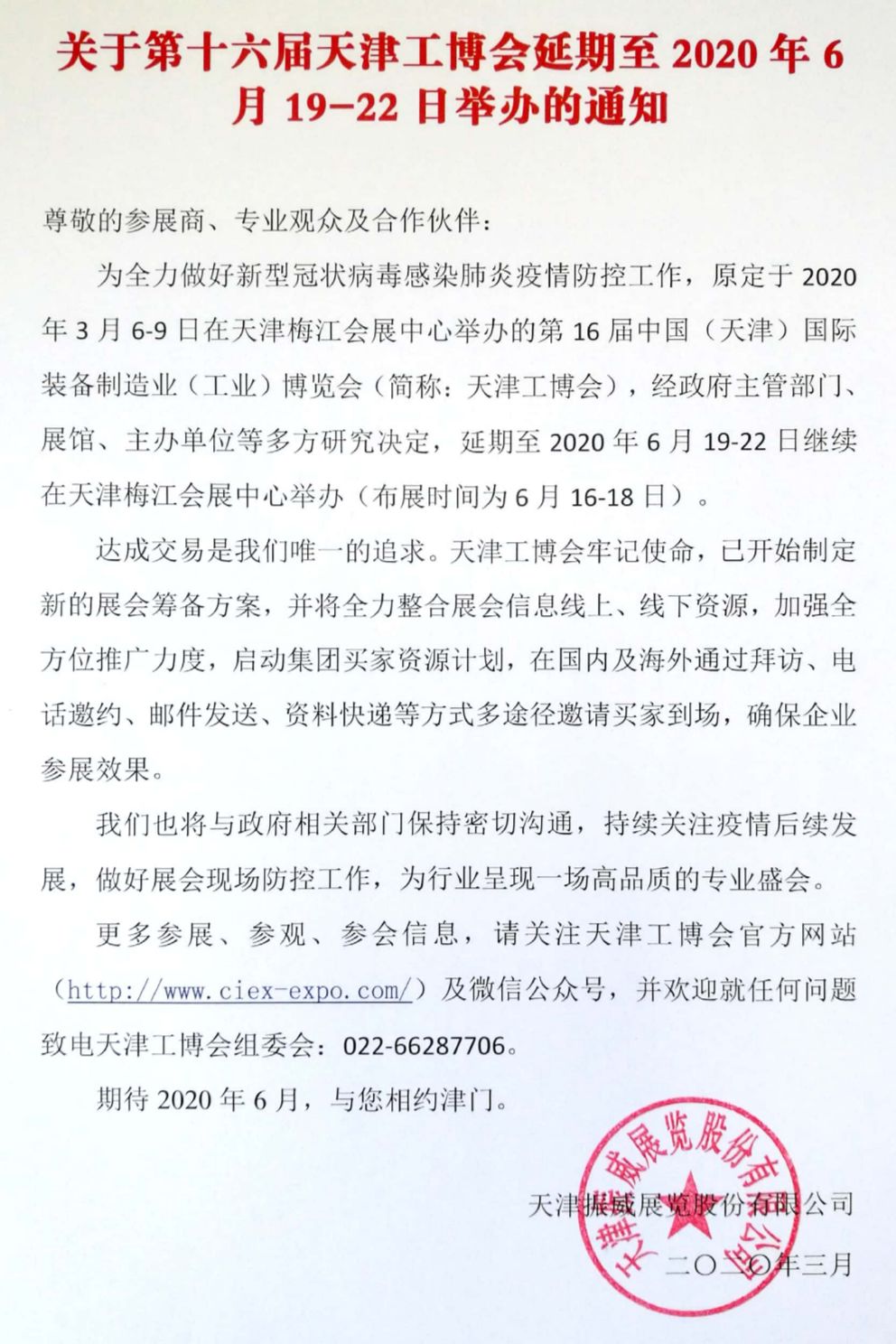 根據(jù)工博會展會設計搭建公司領藝展覽了解到,原定于2020年3月6-9日在天津梅江會展中心舉辦的第16屆中國(天津)國際裝備制造業(yè)(工業(yè))博覽會(簡稱:天津工博會),經(jīng)政府主管部門、展館、主辦單位等多方研究決定,延期至2020年6月19-22日繼續(xù)在天津梅江會展中心舉辦(布展時間為6月16-18日)。如需工博會展會設計請聯(lián)系領藝展覽,希望我們能在工博會展會搭建上為您添磚加瓦,祝各位朋友收獲多多,滿載而歸!