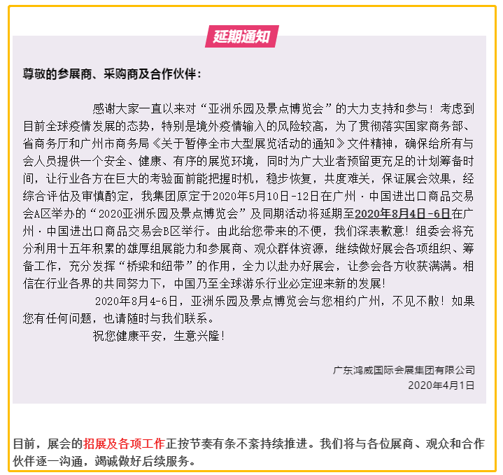 根據(jù)樂園展設計搭建公司領藝展覽了解到,受新冠肺炎疫情影響,原定于2020年5月10日-12日在廣州·中國進出口商品交易會A區(qū)舉辦的“2020亞洲樂園及景點博覽會”及同期活動將延期至2020年8月4日-6日在廣州·中國進出口商品交易會B區(qū)舉行。如需樂園展設計請聯(lián)系領藝展覽,希望我們能在樂園展搭建上為您添磚加瓦,祝各位朋友收獲多多,滿載而歸!