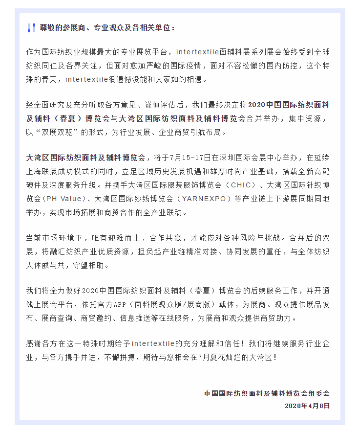 根據(jù)紡織面料展設計搭建公司領藝展覽了解到,2020中國國際紡織面料及輔料(春夏)博覽會與大灣區(qū)國際紡織面料及輔料博覽會合并舉辦,集中資源,以“雙展雙驅”的形式,為行業(yè)發(fā)展、企業(yè)商貿引航布局。