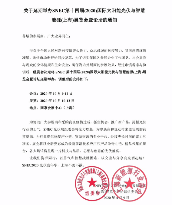 根據(jù)光伏展設(shè)計搭建公司領(lǐng)藝展覽了解到,SNEC第十四屆(2020)國際太陽能光伏與智慧能源(上海)展覽會暨論壇延期至2020年10月10-12日舉行。如需光伏展設(shè)計請聯(lián)系領(lǐng)藝展覽,希望我們能在光伏展搭建上為您添磚加瓦,祝各位朋友收獲多多,滿載而歸!