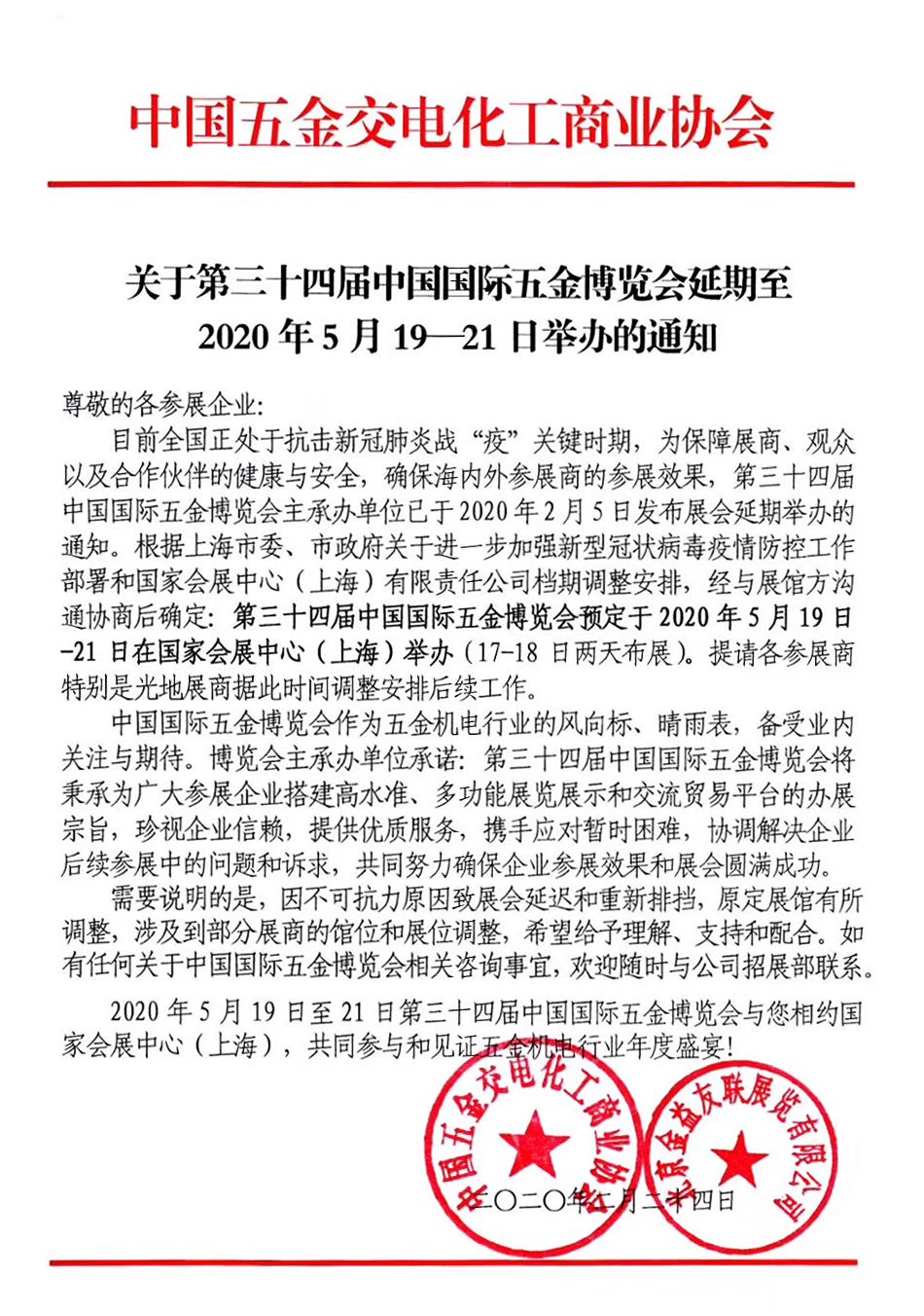 根據(jù)五金展設(shè)計搭建公司領(lǐng)藝展覽解到,為進一步落實新型冠狀病毒感染肺炎疫情防控工作,更為了切實保障廣大參展商、觀眾及合作伙伴的生命安全和身體健康,第三十四屆中國國際五金博覽會預(yù)定于2020年5月19-21日在國家會展中心舉辦。如需五金展設(shè)計請聯(lián)系領(lǐng)藝展覽,希望我們能在五金展搭建上為您添磚加瓦,祝各位朋友收獲多多,滿載而歸!