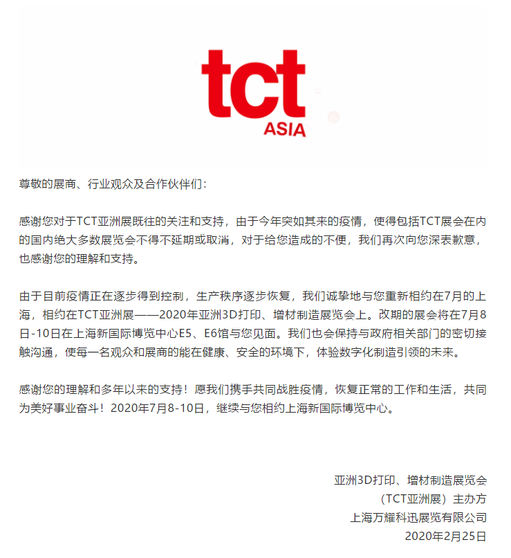 根據(jù)TCT亞洲展——2020年亞洲3D打印、增材制造展覽會設(shè)計搭建公司領(lǐng)藝展覽了解到,由于目前疫情正在逐步得到控制,生產(chǎn)秩序逐步恢復(fù),TCT亞洲展——2020年亞洲3D打印、增材制造展覽會將改期至7月8日-10日在上海新國際博覽中心E5、E6館與您見面。主辦方也會保持與政府相關(guān)部門的密切接觸溝通,使每一名觀眾和展商的能在健康、安全的環(huán)境下,體驗數(shù)字化制造引領(lǐng)的未來。如需上海3D打印展設(shè)計請聯(lián)系領(lǐng)藝展覽,希望我們能在TCT亞洲展搭建上為您添磚加瓦,祝各位朋友收獲多多,滿載而歸!