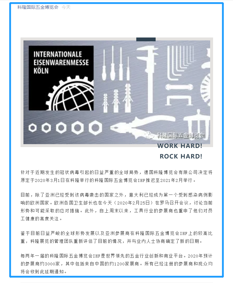 目前,除了亞洲已經(jīng)受到該病毒襲擊的國(guó)家之外,意大利已經(jīng)成為第一個(gè)受到感染病例影響的歐洲國(guó)家。歐洲各國(guó)衛(wèi)生部長(zhǎng)也在今天(2020年2月25日)在羅馬召開(kāi)會(huì)議,討論當(dāng)前形勢(shì)和可能采取的應(yīng)對(duì)措施。此外,自上周末以來(lái),工具行業(yè)的參展商也重申了他們對(duì)員工健康的高度關(guān)注。鑒于目前日益嚴(yán)峻的全球形勢(shì)發(fā)展以及亞洲參展商在科隆國(guó)際五金博覽會(huì)IHF上的較高比重,科隆展覽的管理團(tuán)隊(duì)重新評(píng)估了目前的情況,并與業(yè)內(nèi)人士協(xié)商確定了新的日期。每?jī)赡暌粚玫目坡?guó)際五金博覽會(huì)IHF是世界領(lǐng)先的五金行業(yè)創(chuàng)新和商業(yè)平臺(tái)。2020年預(yù)計(jì)的參展商約3000家,其中包括來(lái)自中國(guó)的約1200家展商。所有已經(jīng)注冊(cè)的參展商和觀(guān)眾均將會(huì)收到此延期通知。如需五金展設(shè)計(jì)請(qǐng)聯(lián)系領(lǐng)藝展覽,希望我們能在五金展搭建上為您添磚加瓦,祝各位朋友收獲多多,滿(mǎn)載而歸!