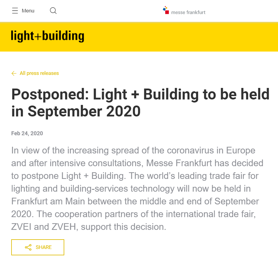 根據(jù)照明展設(shè)計(jì)搭建公司領(lǐng)藝展覽了解到,鑒于冠狀病毒在歐洲的蔓延以及經(jīng)過深入的磋商,法蘭克福展覽有限公司已決定推遲Light + Building?,F(xiàn)世界領(lǐng)先的照明和建筑服務(wù)技術(shù)貿(mào)易展覽會(huì)將延期至2020年9月中旬至美因河畔法蘭克福舉行。如需照明展設(shè)計(jì)請(qǐng)聯(lián)系領(lǐng)藝展覽,希望我們能在照明展搭建上為您添磚加瓦,祝各位朋友收獲多多,滿載而歸!