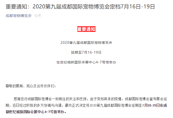 根據(jù)成都寵物展設(shè)計搭建公司領(lǐng)藝展覽了解到,由于突如其來的疫情,成都國際寵博會宣布展會延期,近日經(jīng)過積極的多方協(xié)調(diào)與溝通,最終正式?jīng)Q定將2020第九屆成都國際寵博會延期至7月16-19日在成都世紀(jì)城新國際會展中心4-7號館舉辦。如需成都寵物展設(shè)計請聯(lián)系領(lǐng)藝展覽,希望我們能在成都寵物展搭建上為您添磚加瓦,祝各位朋友收獲多多,滿載而歸!