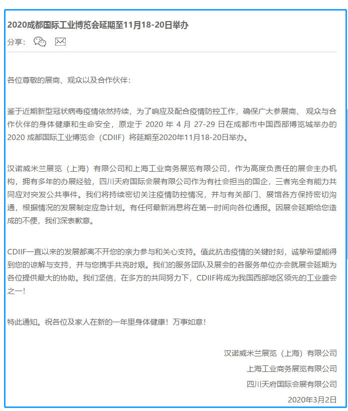 根據(jù)工博會(huì)設(shè)計(jì)搭建公司領(lǐng)藝展覽了解到,原定于 2020 年 4 月 27-29 日在成都市中國西部博覽城舉辦的2020 成都國際工業(yè)博覽會(huì)(CDIIF)將延期至2020年11月18-20日舉辦。 如需工博會(huì)展臺(tái)設(shè)計(jì)請聯(lián)系領(lǐng)藝展覽,希望我們能在工博會(huì)展臺(tái)搭建上為您添磚加瓦,祝各位朋友收獲多多,滿載而歸!