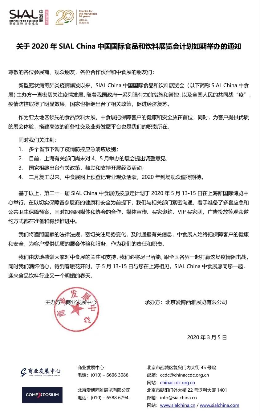 根據(jù)上海展臺設(shè)計搭建公司領(lǐng)藝展覽了解到,2020年 SIAL China 中食展計劃如期舉辦。如需上海中食展展臺設(shè)計請聯(lián)系領(lǐng)藝展覽,希望我們能在中食展展臺搭建上為您添磚加瓦,祝各位朋友收獲多多,滿載而歸!