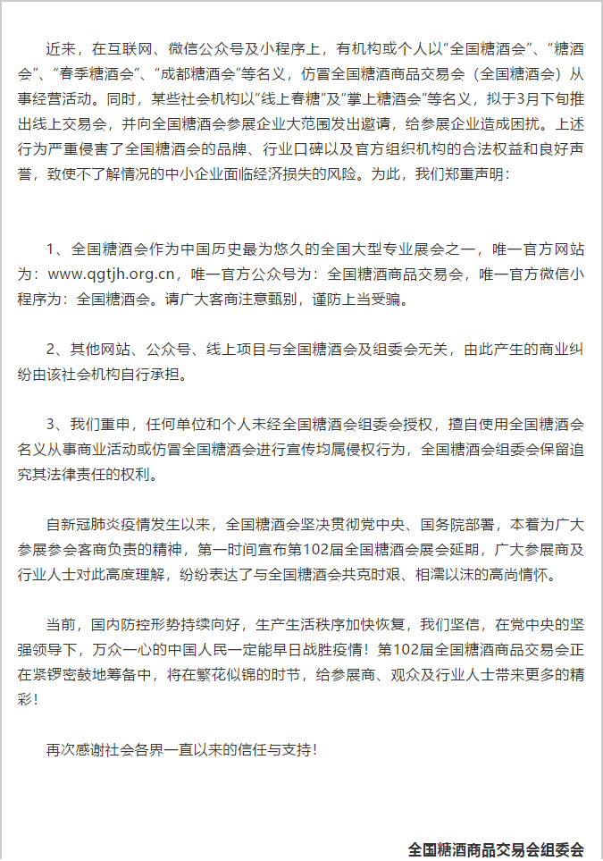 根據(jù)糖酒會(huì)設(shè)計(jì)搭建公司領(lǐng)藝展覽從糖酒會(huì)組委會(huì)官網(wǎng)了解到,近來(lái),在互聯(lián)網(wǎng)、微信公眾號(hào)及小程序上,有機(jī)構(gòu)或個(gè)人以“全國(guó)糖酒會(huì)”、“糖酒會(huì)”、“春季糖酒會(huì)”、“成都糖酒會(huì)”等名義,仿冒全國(guó)糖酒商品交易會(huì)(全國(guó)糖酒會(huì))從事經(jīng)營(yíng)活動(dòng)。同時(shí),某些社會(huì)機(jī)構(gòu)以“線(xiàn)上春糖”及“掌上糖酒會(huì)”等名義,擬于3月下旬推出線(xiàn)上交易會(huì),并向全國(guó)糖酒會(huì)參展企業(yè)大范圍發(fā)出邀請(qǐng),給參展企業(yè)造成困擾。上述行為嚴(yán)重侵害了全國(guó)糖酒會(huì)的品牌、行業(yè)口碑以及官方組織機(jī)構(gòu)的合法權(quán)益和良好聲譽(yù),致使不了解情況的中小企業(yè)面臨經(jīng)濟(jì)損失的風(fēng)險(xiǎn)。