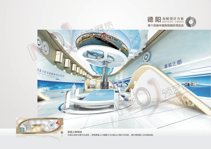 契合德陽(yáng)地區(qū)的品牌形象和產(chǎn)品特性,以齒輪元素為主造型,中部展區(qū)采用雙通道多媒體視頻循環(huán)播放展示德陽(yáng)發(fā)展路程的視頻,并配以桌椅可供來(lái)賓洽談休息,從中體現(xiàn)德陽(yáng)人們的建設(shè)百萬(wàn)人口大城市的成效及夢(mèng)想。